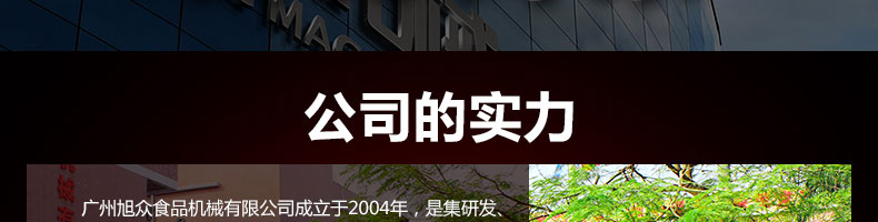 廣州旭眾食品機(jī)械有限公司是一家集科研開發(fā),生產(chǎn)設(shè)計,營銷服務(wù)為一體的現(xiàn)代化生產(chǎn)企業(yè)?,F(xiàn)代化生產(chǎn)車間,精湛制造技術(shù),所產(chǎn)機(jī)械歷經(jīng)市場重重考驗(yàn),不斷贏得海內(nèi)外客戶的贊譽(yù)。